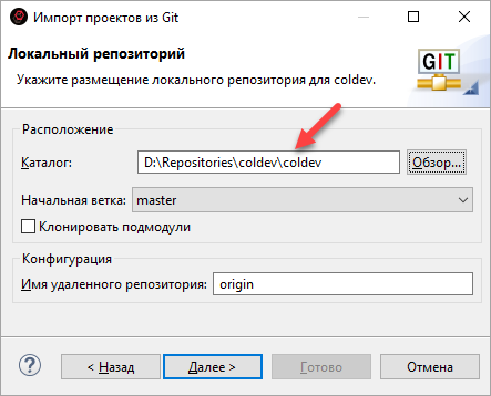 В результате в вашей локальной папке будет создана папка .git и папка с именем исходного репозитория (coldev в вашем случае). Будут скачаны все данные для этого репозитория и будет извлечена рабочая копия последней версии.