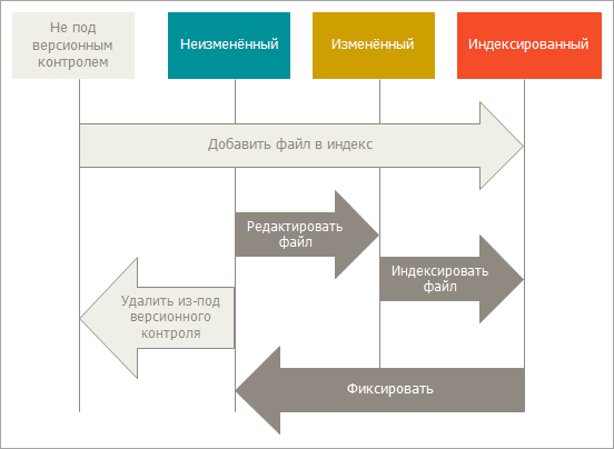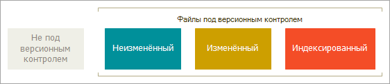 Запомните, каждый файл в вашем рабочем каталоге может находиться в одном из двух состояний: под версионным контролем и не под версионным контролем. Файлы под версионным контролем — это те файлы, которые были в последнем снимке состояния проекта. Они могут быть неизмененными, измененными и индексированными. Файлы не под версионным контролем — это все остальное, любые файлы в вашем рабочем каталоге, которые не входили в ваш последний снимок состояния и не подготовлены к фиксации.