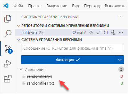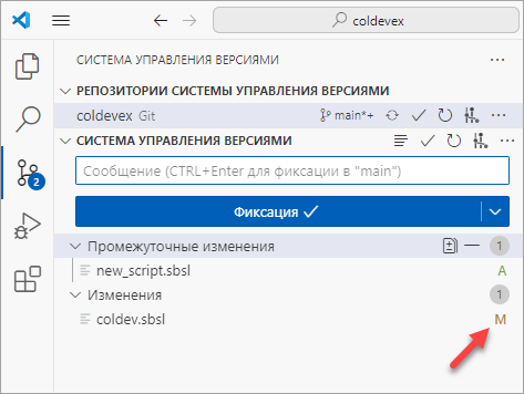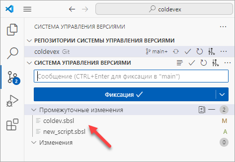 Файл coldev.sbsl находится в разделе Изменения (Changes) и отмечен буквой M — Изменен (Modified). Это означает, что отслеживаемый файл был изменен в рабочем каталоге, но пока не проиндексирован.
