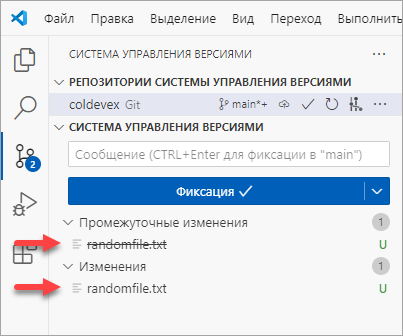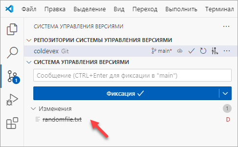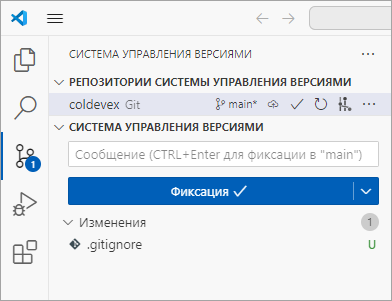 Допустим, вы добавили в индекс все измененные файлы и готовы к коммиту. Простейший способ зафиксировать изменения?—?это ввести сообщение коммита и нажать Фиксация (Commit) в представлении Система управления версиями (Source Control).