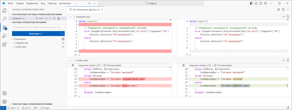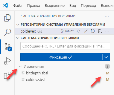 Допустим, вы изменили файлы bitdepth.sbsl и coldev.sbsl без индексирования. Если вы откроете представление Система управления версиями (Source Control), вы увидите что эти файлы изменены и они не включены в индекс.