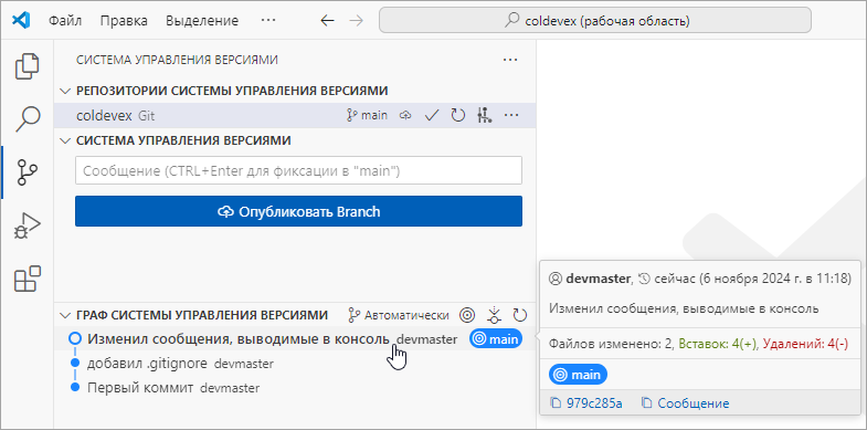 В простейшем виде она содержит сообщение вашего коммита (Изменил сообщения, выводимые в консоль) и имя пользователя, выполнившего коммит (devmaster). Также в конце строки указана ветка, в которую выполнен этот коммит (main). Если вы наведете мышь на строку коммита, то в подсказке увидите более подробную информацию о коммите: какая контрольная сумма SHA-1 у этого коммита (979c285a), сколько файлов было изменено (2 файла), а также статистику по добавленным и удаленным строкам в этом коммите.