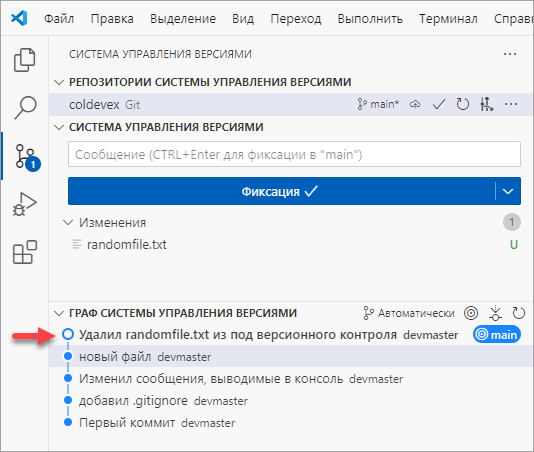 Итак, вы создали коммит, раздел Система управления версиями (Source Control) очистился (ваш рабочий каталог соответствует последнему коммиту, находящемуся в репозитории), а в разделе Граф системы управления версиями (Source Control Graph) появилась запись о вашем коммите.
