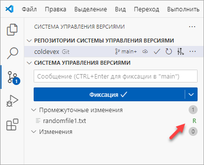 Однако как только вы поместите эти изменения в индекс, картина изменится и Visual Studio Code покажет вам, что файл был переименован. Она отметит его значком R — Переименовано в индексе (Index Renamed).