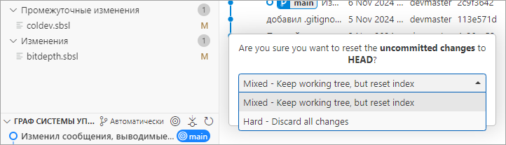 Mixed — Keep working tree, but reset index. В этом случае будет отменено добавление в индекс всех файлов, которые в нем есть на данный момент и еще не зафиксированы. То есть, на картинке, файл coldev.sbsl переедет в раздел Изменения (Changes).