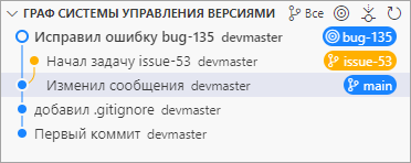 Обратите внимание на то, что все изменения из ветки bug-135 не включены в вашу ветку issue-53. Если их нужно включить, вы можете влить ветку main в вашу ветку issue-53. Либо вы можете отложить слияние этих изменений до завершения работы, а затем переключиться на ветку main и влить ветку issue-53 в main.