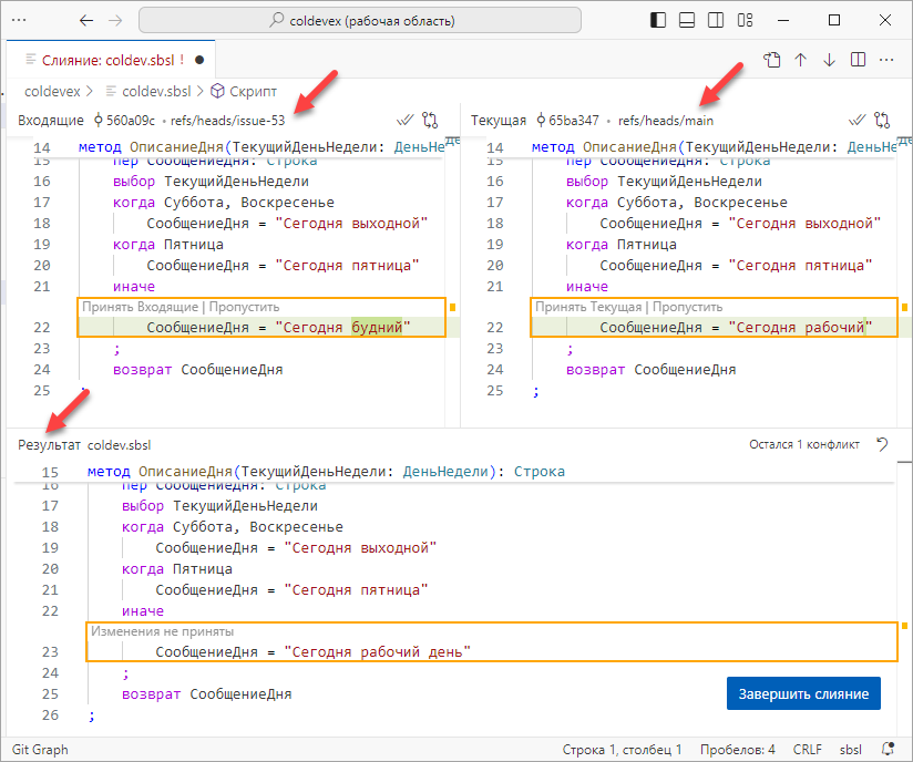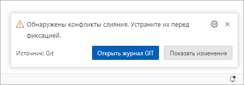 Чтобы разрешить конфликт, можно нажать Открыть журнал GIT в сообщении, и тогда вы увидите сам конфликтный файл в том виде, в котором он присутствует в рабочей области.