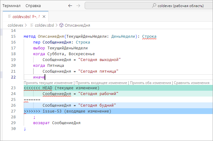 Если этот результат вас не устраивает, вы можете разрешить каждый конфликт в отдельности (принять, например, входящие изменения) или принять все входящие изменения сразу, если знаете, что в ветке issue-53 содержится именно тот вариант файла, который вам нужен.