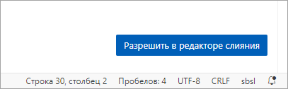 Чтобы открыть файл в редакторе слияния, можно нажать кнопку Разрешить в редакторе слияния, которая появляется в правом нижнем углу окна редактора файла.