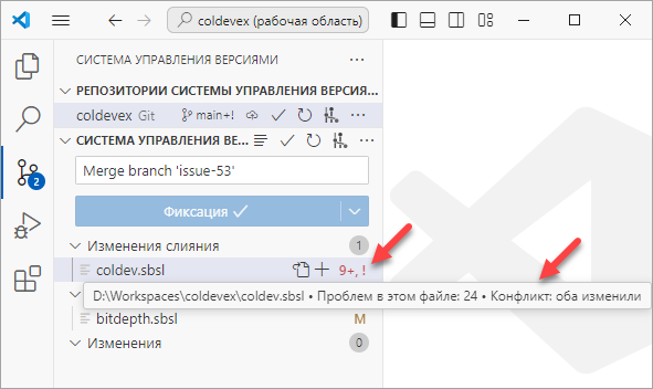 Во-первых, в разделе Система управления версиями (Source Control) она покажет файлы, в которых обнаружен конфликт. Они будут отмечены значком ! Конфликт: оба изменили (Conflict: Both Modifyed)
