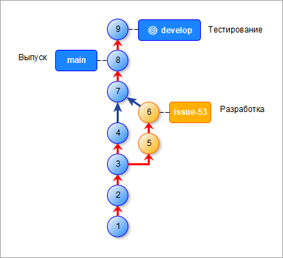 Многие разработчики, использующие Git, придерживаются именно такого подхода, оставляя полностью стабильный код только в ветке main. При этом существует и параллельная ветка с именем develop или next, служащая для работы и тестирования стабильности. После достижения стабильного результата ее содержимое вливается в ветку main. Эта ветка develop используется для вливания в нее завершенных задач из тематических веток (временных веток наподобие issue-53), чтобы гарантировать, что эти задачи проходят тестирование и не вносят ошибок.