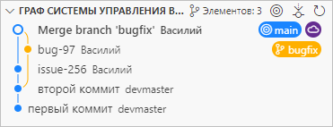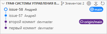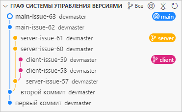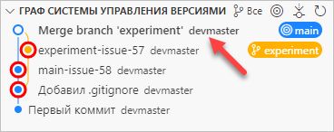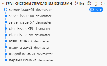 Наконец, вы возвращаетесь в ветку main и делаете пару коммитов main-issue-62 и main-issue-63.