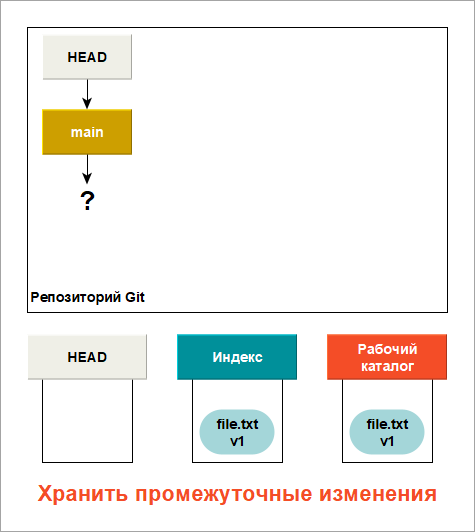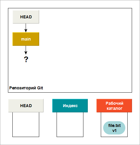 Рассмотрите этот процесс: допустим вы перешли в новый каталог, содержащий один файл. Данная версия этого файла обозначается v1 и изображается голубым цветом. Создайте Git-репозиторий, и его ссылка HEAD станет указывать на еще несуществующую ветку (ветка main пока не существует).