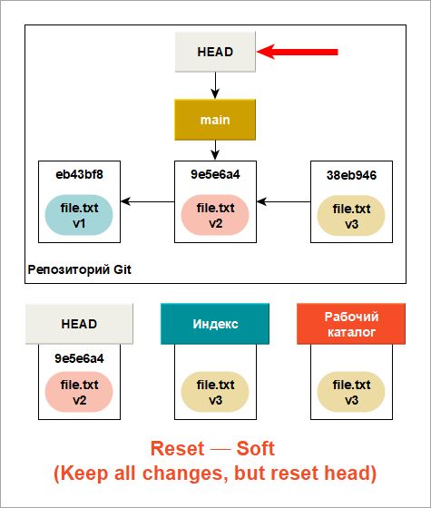 Первое, что сделает Reset current branch to this Commit... — переместит то, на что указывает HEAD. Обратите внимание, изменяется не сам HEAD, что происходит при выполнении команды Checkout Branch. Команда Reset current branch to this Commit... перемещает ветку, на которую указывает HEAD. Таким образом, если HEAD указывает на ветку main (то есть вы сейчас работаете с веткой main), выполнение команды сделает так, что main будет указывать на коммит 9e5e6a4.