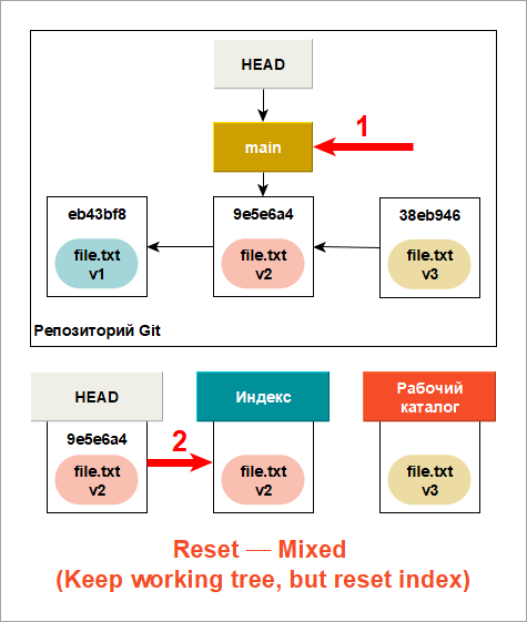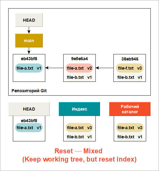 Теперь взгляните на диаграмму и постарайтесь разобраться, что случилось: фактически была отменена последняя команда Фиксация (Commit). Когда вы выполняете Фиксация (Commit), Git создает новый коммит и перемещает на него ветку, на которую указывает HEAD. Если вы выполняете Reset current branch to this Commit... на предыдущий коммит, то вы перемещаете ветку туда, где она была раньше, не изменяя при этом ни индекс, ни рабочий каталог.