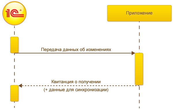 После получения сообщения-квитанции конфигурация помечает все изменения, переданные в предыдущем сообщении, как успешно синхронизированные. Лишь несинхронизированные изменения в объектах (создание новых, изменение и удаление существующих) будут отправлены во внешнее приложение при следующем сеансе синхронизации.