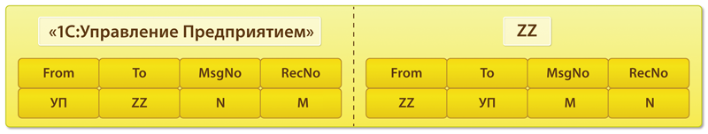 Обратите внимание, что в приложении ZZ в таблице с информацией об обмене данными с конфигурацией в полях MessageNo и ReceivedNo лежат цифры, зеркально отображенные из аналогичной таблицы конфигурации: приложение ZZ получило от конфигурации M сообщений и отправило в конфигурацию N сообщений.