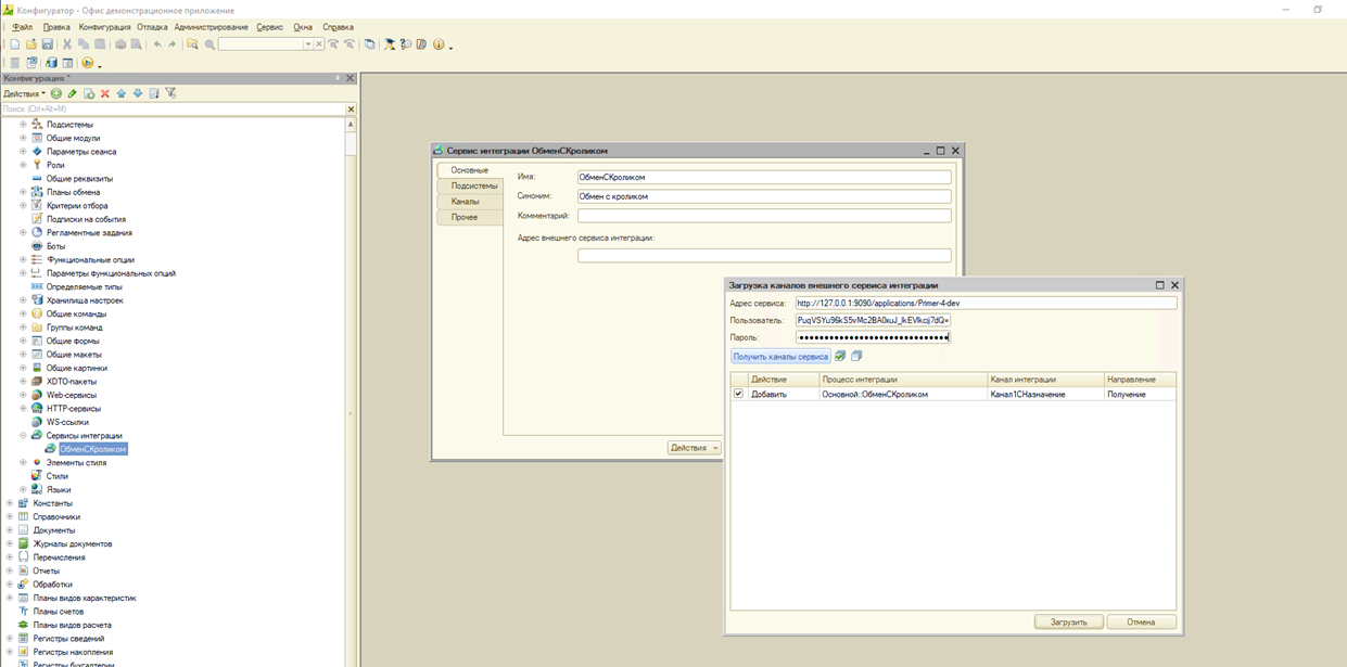 В списке доступных сервисов интеграции вы увидите единственную запись Обмен с кроликом — этот тот самый сервис интеграции, который вы создали в Конфигураторе.