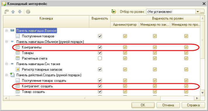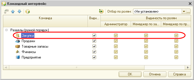4. Откроем окно редактирования роли (например, Менеджер по закупкам) и проверим, что в правах этой роли разрешено использование искомой команды. Если речь идет о стандартной команде (например, открытия списка справочника) – нужно проверить права на сам объект.