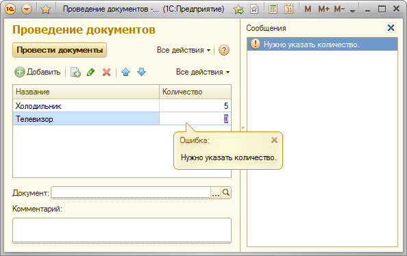 Аналогичным образом можно привязать сообщение и к любой ячейке таблицы, расположенной в форме. В этом случае кроме имени реквизита, содержащего таблицу, необходимо будет указать индекс нужной строки в таблице и имя колонки таблицы. Например, так: