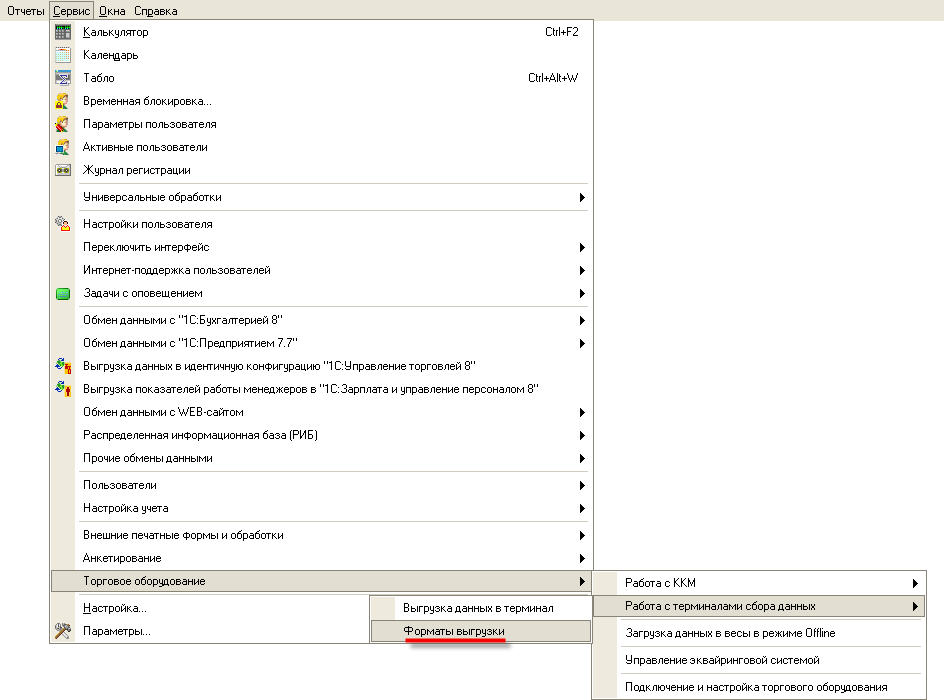 Вызов механизма выгрузки осуществляется из меню "Сервис" -> "Торговое оборудование" -> "Работа с терминалами сбора данных" -> "Выгрузка данных в терминал".