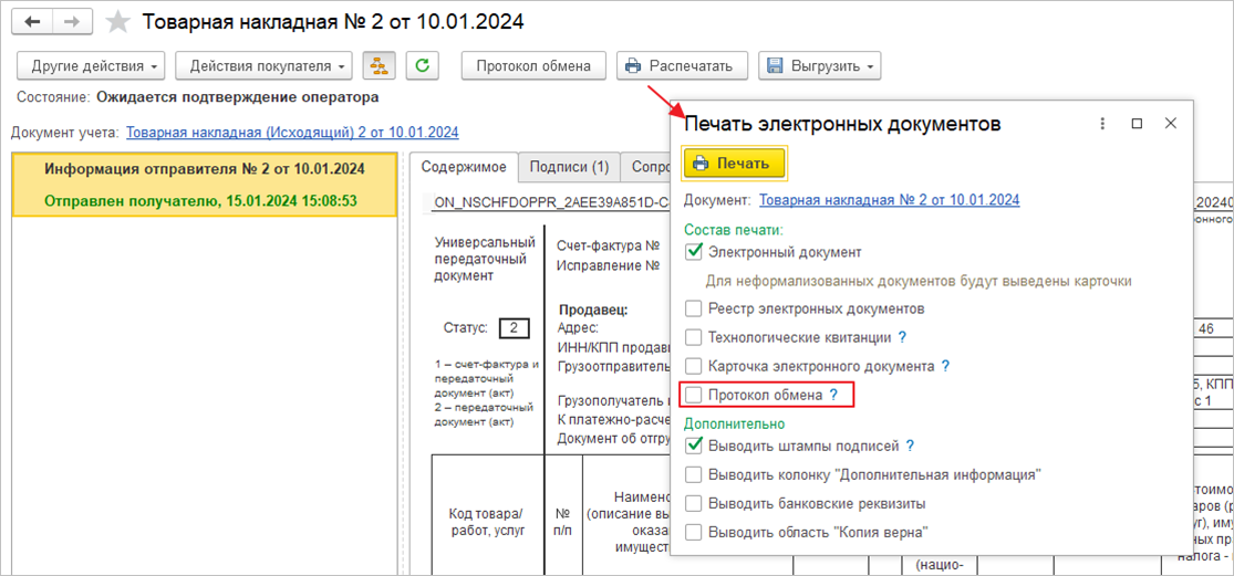 ● Реализована печатная форма «Протокол обмена», в которой представлена сводная информация о документообороте. Открыть ее можно во время просмотра электронного документа при установке соответствующего флага в меню «Печать электронных документов».