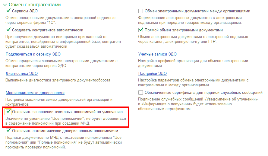 ● Реализована возможность отключить автоматическое прохождение проверки полномочий для подписей документов по МЧД с текстовыми полномочиями “Все полномочия” или “Полные полномочия”. Опцию можно найти в меню Администрирование - Обмен электронными документами - Обмен с контрагентами - Отключить автоматическое доверие полным полномочиям.