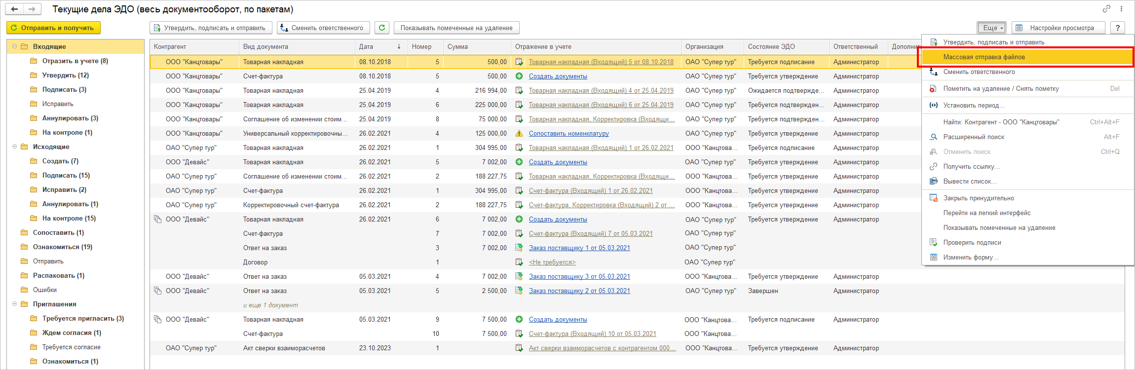 ● Реализована возможность массового создания произвольных электронных документов и дальнейшая их отправка одному или нескольким контрагентам.