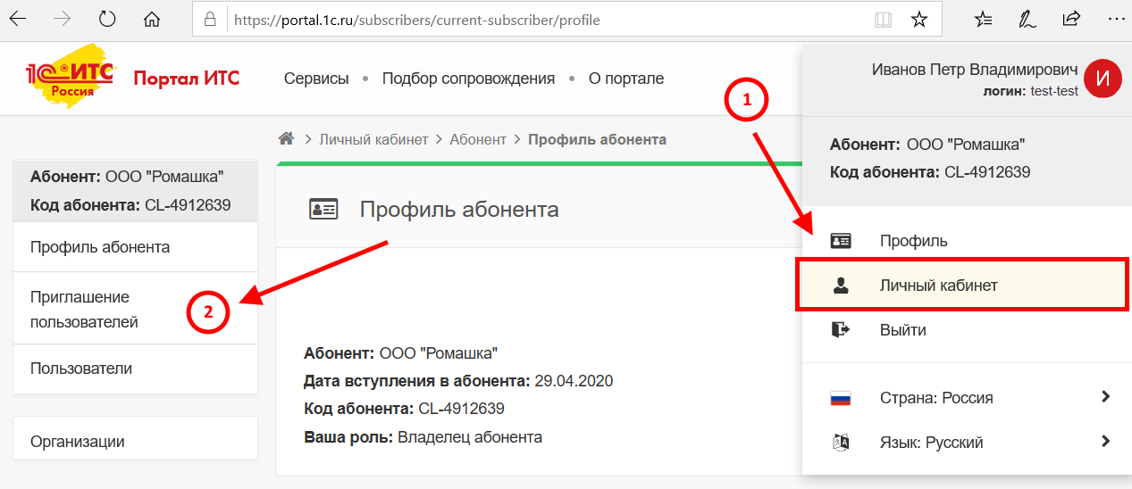 После успешной авторизации откроется Личный кабинет пользователя на Портале 1С:ИТС с подтверждением, что предоставлен доступ к Информационной системе 1С:ИТС (its.1c.ru) с логином и паролем, которые сотрудник организации придумал (или использовал, если они уже были) на этапе авторизации.