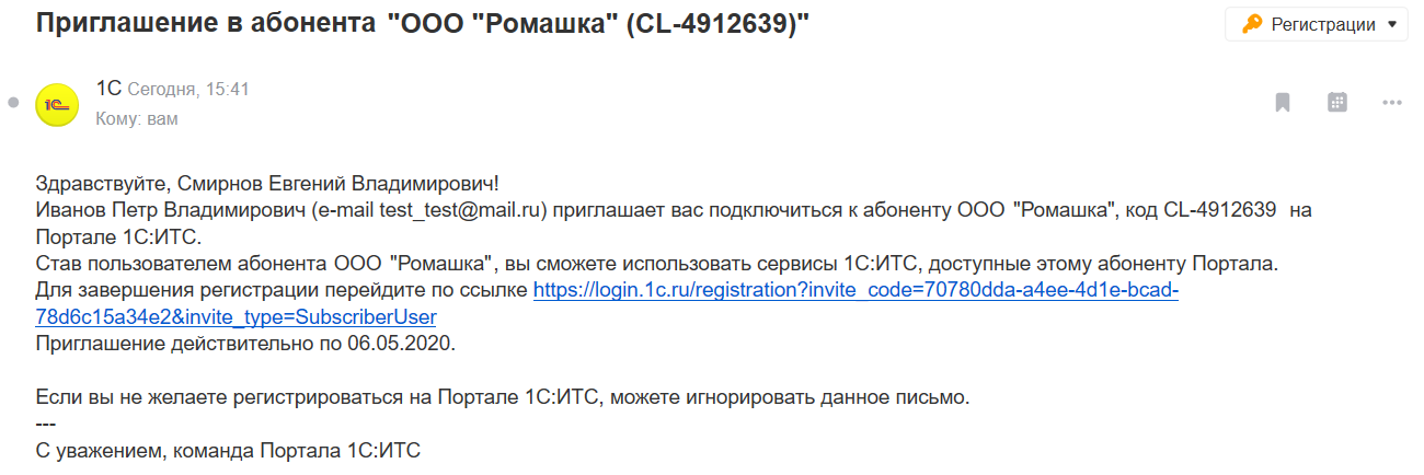 После того как партнер зарегистрирует ваш договор в фирме "1С", вам будет выслано электронное уведомление о доступе к Информационной системе 1С:ИТС. Письмо отправляется по адресу, который партнер указал при регистрации договора в фирме "1С".