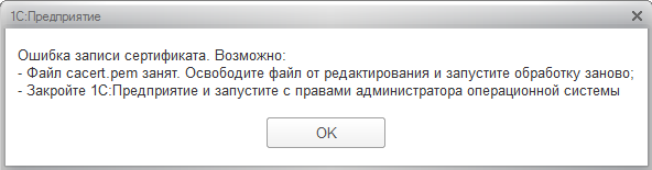 Обработка поможет тем, кто использует файловый вариант работы 1С:Предприятия и не хочет искать файл cacert.pem. Достаточно запустить обработку (архив с обработкой доступен тут: обработка.epf) и нажать на кнопку "Обновить cacert.pem".
