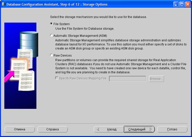 На шестом шаге следует выбрать механизм хранения, который будет использован СУБД. По умолчанию выбрана файловая система. Нажмите Следующий >.