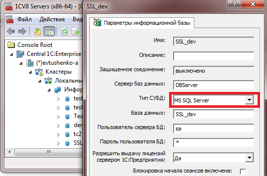 Необходимо узнать тип СУБД, на котором размещена база данных. Для этого можно воспользоваться консолью администрирования, посмотрев свойства информационной базы.