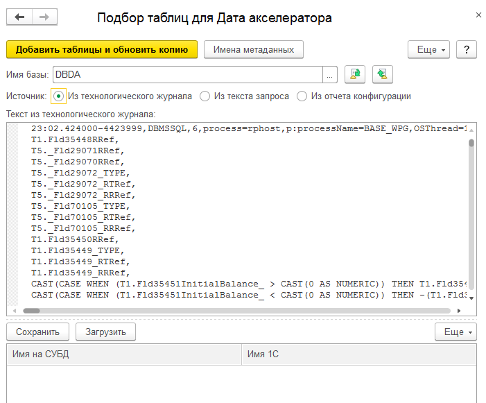 Далее потребуется понять, к каким таблицам идет обращение на СУБД при выполнении отчета. Сделать это можно с помощью технологического журнала. Ознакомиться с тем, что такое технологический журнал можно по ссылке https://its.1c.ru/db/v83doc#bookmark:adm:TI000000446