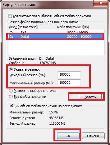 Выбираем диск для размещения файла подкачки. Выбираем переключатель Указать размер. Указываем размер файла подкачки (и минимальный, и максимальный). Нажимаем кнопку Задать, затем ОК. Выполняем перезагрузку компьютера.