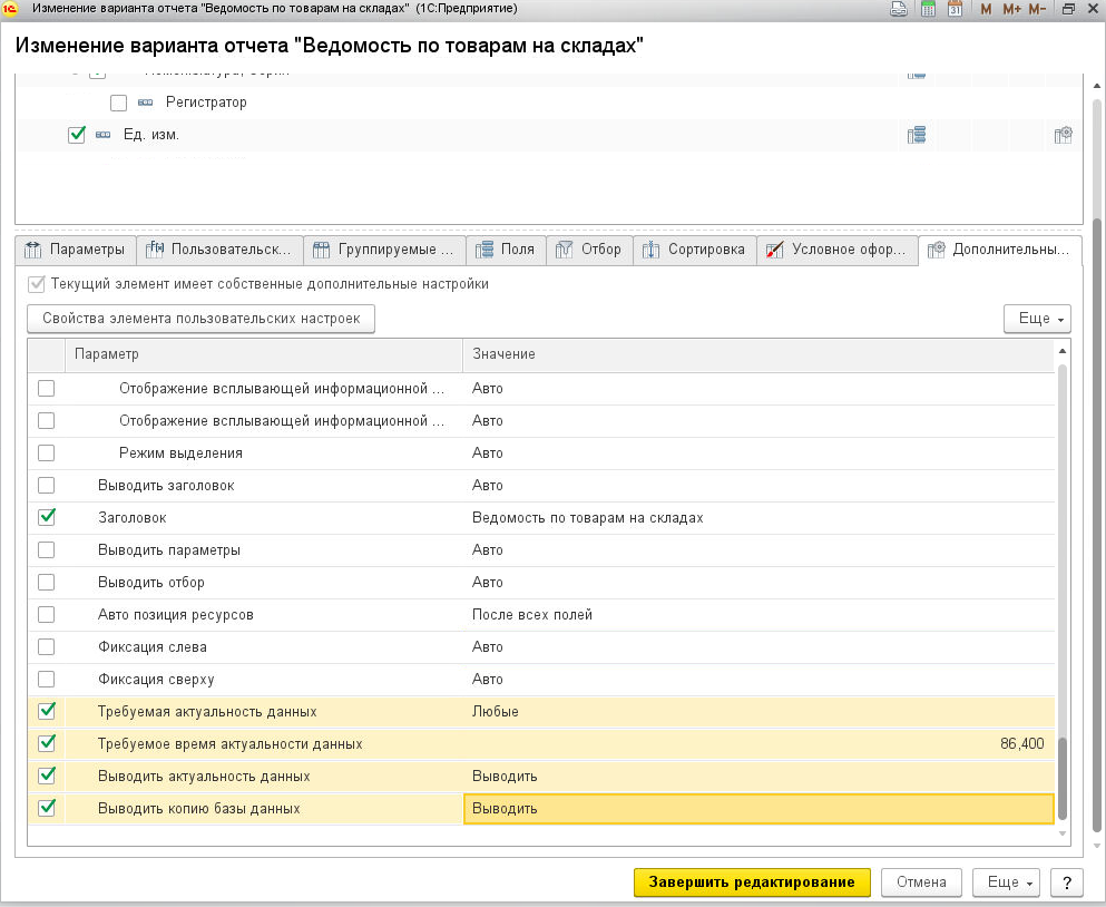 В схеме компоновки данных за использование копии базы данных отвечают параметры Требуемая актуальность данных и Требуемое время актуальности данных на закладке Дополнительные настройки. Параметры Выводить актуальность данных и Выводить копию базы данных позволяют увидеть, где фактически выполнился запрос. Информация выводится в шапке отчета.