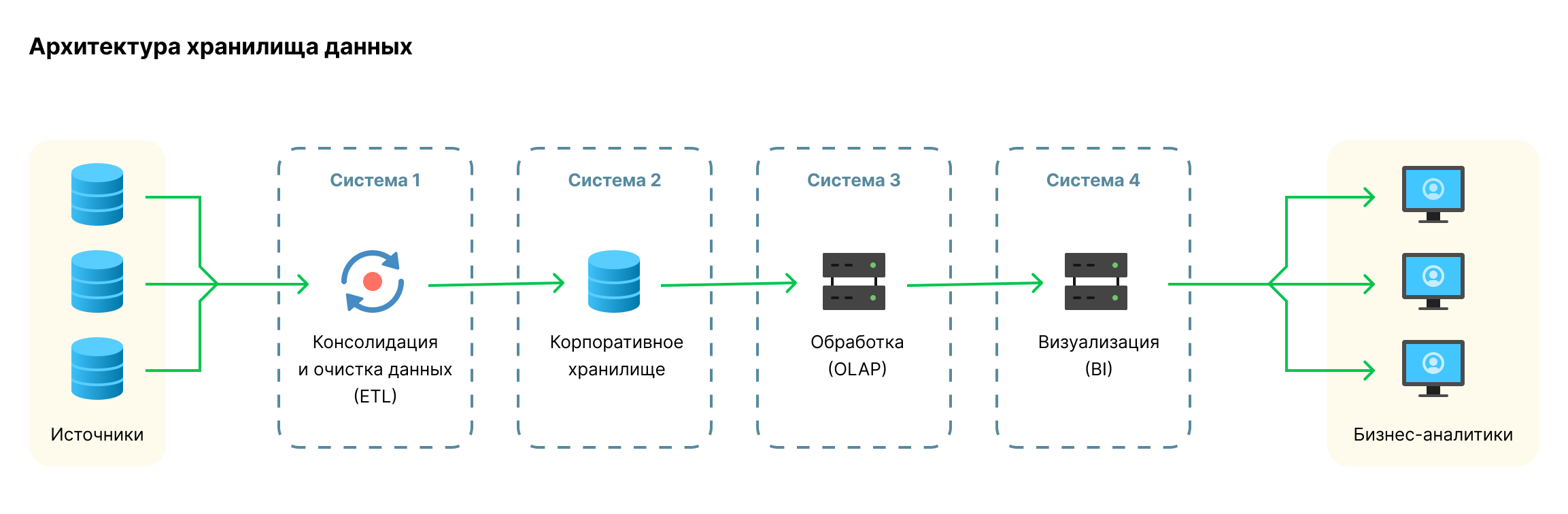 Построением аналитических систем для руководства компаний и бизнес-аналитиков компьютерщики занимаются не первое десятилетие. Здесь так же, как и для транзакционной обработки данных в СУБД, есть классический набор подходов и технологий, но большая часть из них посвящена не интерфейсу программы, с которой общается руководитель, а подготовке, хранению и обработке данных. Приведу ниже список таких терминов/технологий. Внедряются они обычно в такой же последовательности, как и перечислены, цепочкой одна технология после другой.