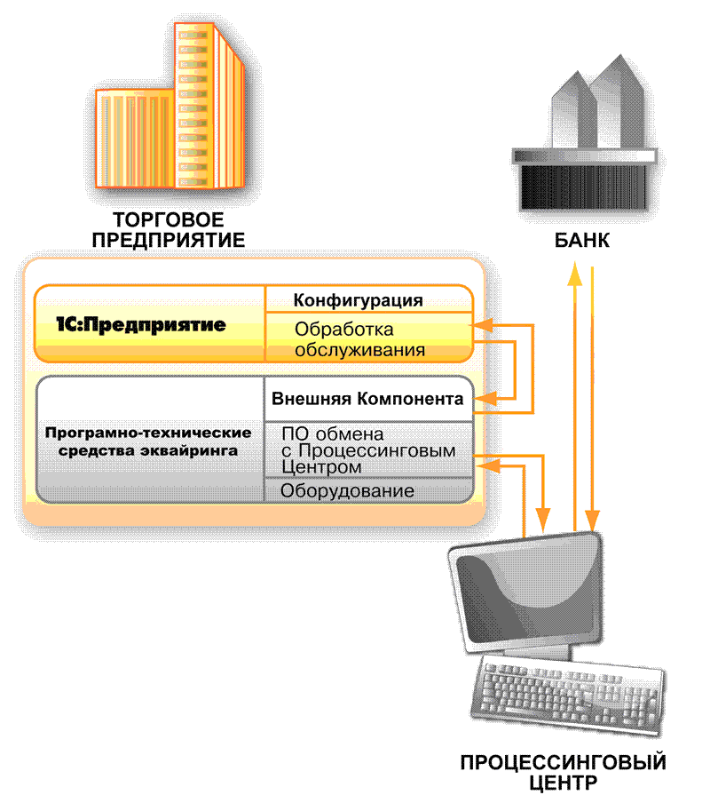 Для организации взаимодействия в системе "1С:Предприятие 8" поставляется специальная обработка обслуживания, а программное обеспечение системы эквайринга должно содержать специальную внешнюю компоненту.