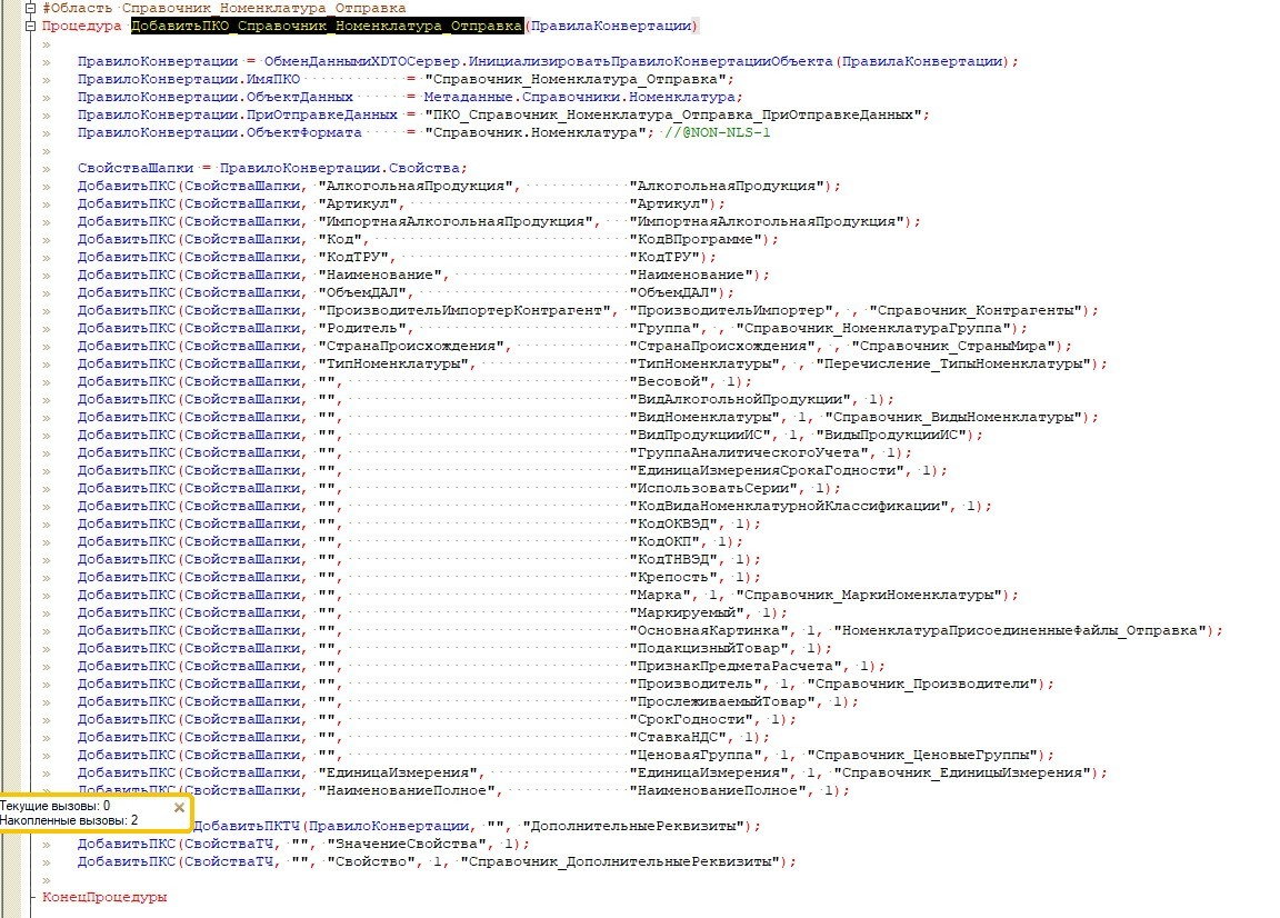 После всех подготовительных работ нужно перейти непосредственно к моменту описания выгрузки самих свойств. Для этого необходимо использовать менеджер конвертации, а именно общий модуль МенеджерОбменаЧерезУниверсальныйФормат. Далее нужно поправить метод инициализации ПКО ДобавитьПКО_Справочник_Номенклатура_Отправка как показано на рисунке ниже. Основная задача - описать выгрузку новых свойств, при этом необходимо указать, в каком пространстве имен они будут выгружены.