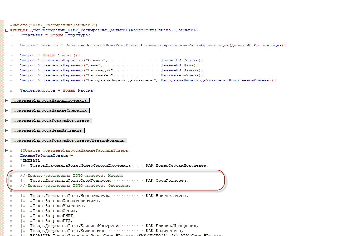 Далее нам необходимо добавить в процедуру выборки данных новое поле. Для этого нужно изменить алгоритм ПТиУ_РасширенныеДанныеИБ(), который вызывается при работе обработчика ПриОтправкеДанных выгрузки документа. Поскольку алгоритм большой, то в статье демонстрируется только одна из правок.