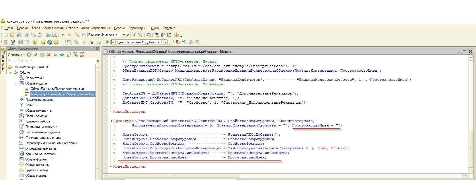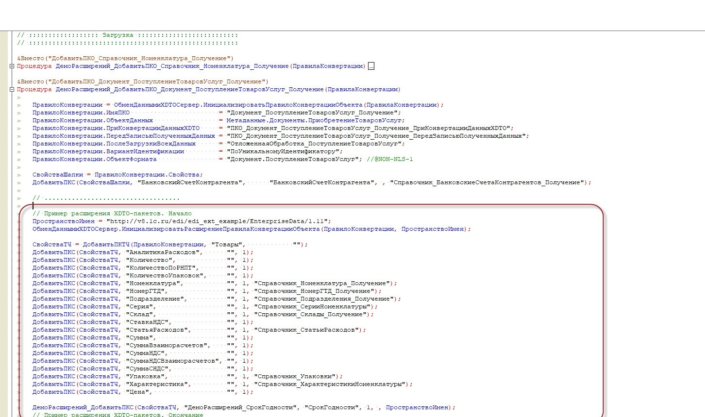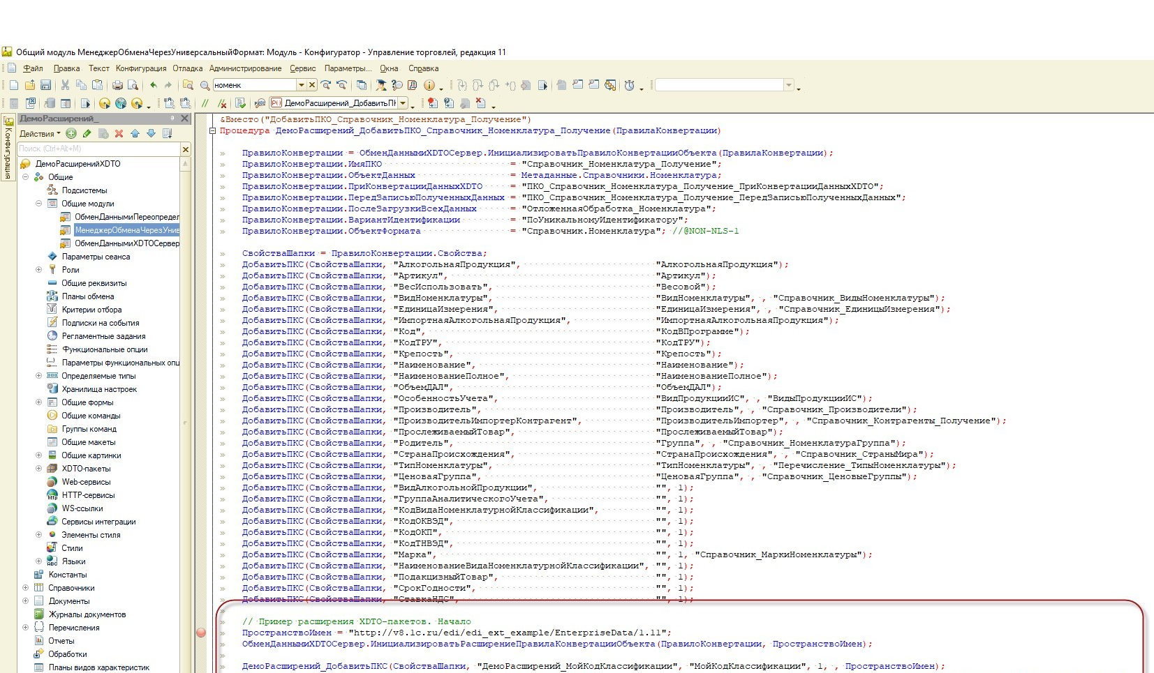 При работе с расширениями рекомендуется делать одно расширение и для источника, и приемника, т.к. для системы важно обладать идентичным составом свойств, у которых обязательно должно совпадать пространство имен (URI). Порядок добавленных свойств тоже должен быть одинаков в двух информационных базах, иначе будет ошибка чтения файла. Обновление таких расширений можно делать через сравнение/объединение, или автоматизировать процесс установки/обновления расширений в нескольких ИБ при помощи пакетного режима работы 1С: Предприятия. Далее приступаем к загрузке. Начинаем с добавления нашего расширение в приемник. Поскольку в расширении уже есть изменения, которые инициализируют XDTO-пакет в общем модуле ОбменДаннымиПереопределяемый, мы начнем работу с правки ПКО загрузки справочника Номенклатура. Для этого переходим в метод ДобавитьПКО_Справочник_Номенклатура_Получение менеджера конвертации и добавим описание новых свойств.