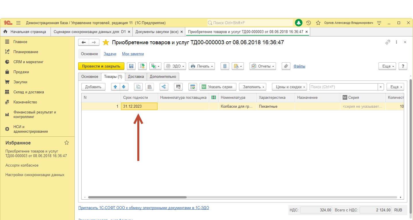 Для решения задачи нам нужно добавить поле СрокГодности в табличную часть Товары, вывести новое поле в форму.