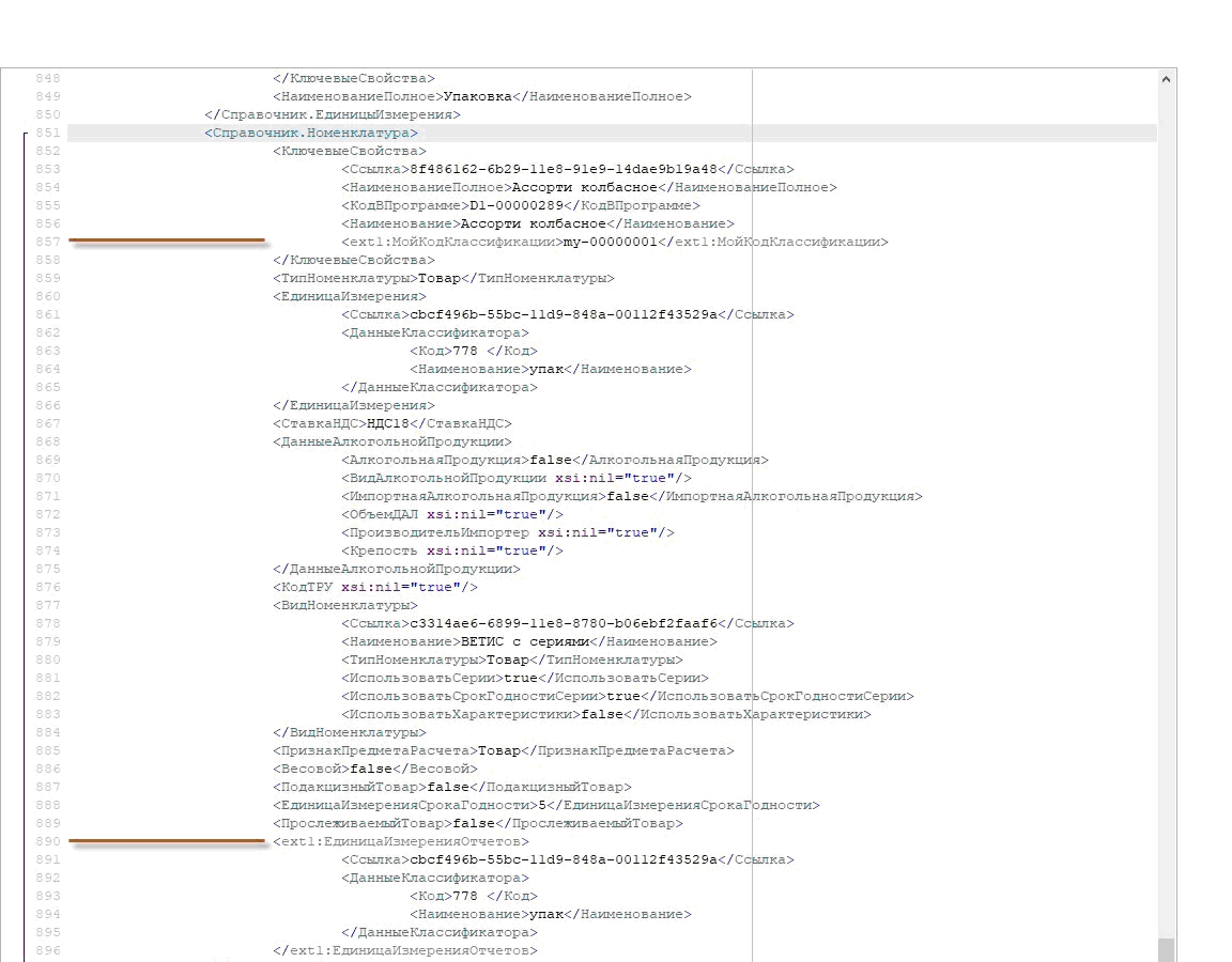 Если все предыдущие пункты выполнены правильно, то выгруженная номенклатура в файле сообщения будет содержать данные по расширенным свойствам. При этом такие узлы будут маркироваться соответствующим URI.