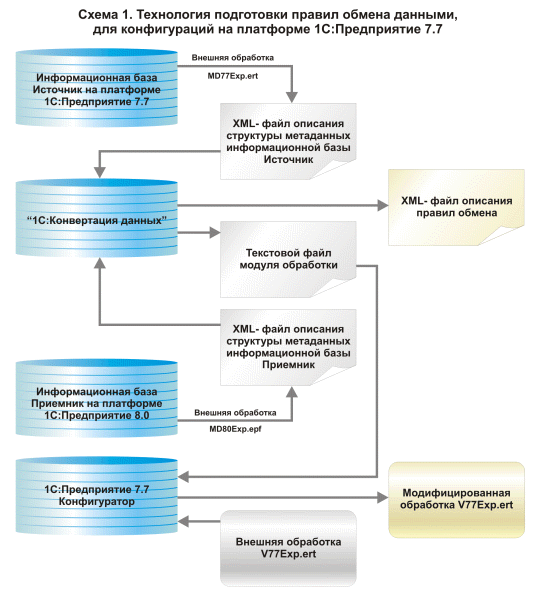 Как видно на схеме, для получения описания метаданных конфигурации на платформах "1С:Предприятие 7.7" используется специализированная обработка MD77Exp.ert. После этого описание метаданных помещается в информационную базу "Конвертации данных 2.0", проводится настройка правил обмена.