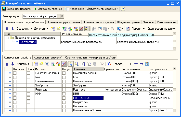 Начнем с создания правил конвертации справочника Контрагенты. Создадим новый элемент справочника Конвертации и откроем уже знакомую нам форму "Настройка правил конвертации". С помощью обработок автогенерации создадим правило конвертации объектов Контрагенты, и правила конвертации свойств со следующими приемниками: ПометкаУдаления, Код, Наименование, ЭтоГруппа, Родитель, ИНН, ЮрФизЛицо,  Покупатель, Поставщик, НаименованиеПолное.