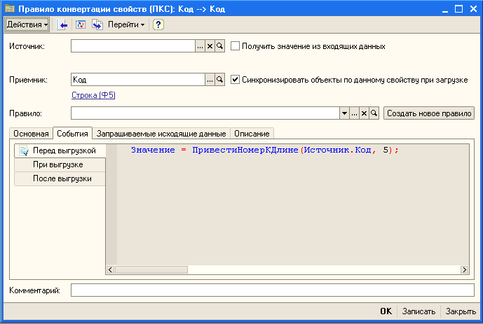 Откроем форму правила конвертации свойства Код, очистим реквизит Источник и поместим в поле "Перед выгрузкой" следующий программный код: