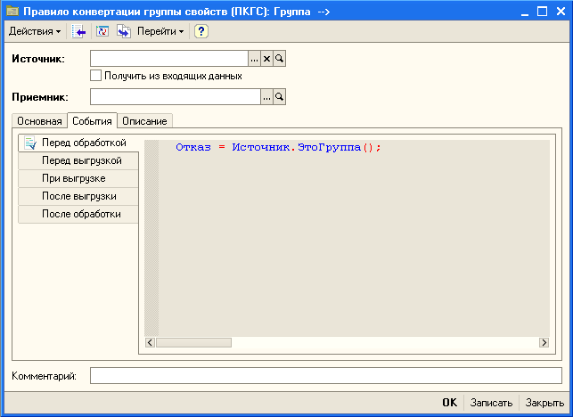 Здесь мы используем очень важную переменную Отказ. Управление этой переменной позволяет прервать процесс обработки правила конвертации свойств, а в данном случае группы правил. Переменная Отказ доступна практически во всех обработчиках событий и используется одинаково - для отказа от выполнения действия.