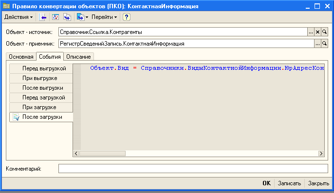 Мы хотим добиться чтобы при обработке этого правила вызывалось правило конвертации КонтактнаяИнформация1, но при этом реквизит Комментарий оставался пустым, поскольку ссылка на запись регистра сведений абсолютно нам не нужна, и более того ее присутствие может привести к ошибке при загрузке. Для того чтобы ссылка не была записана, используем обработчик "После выгрузки" со следующим программным кодом: