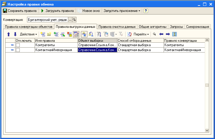 Теперь юридический адрес будет выгружаться при конвертации контрагентов, поэтому не требуется обходить справочник Контрагенты два раза. Надо только не забыть отключить использование правила выгрузки данных КонтактнаяИнформация.