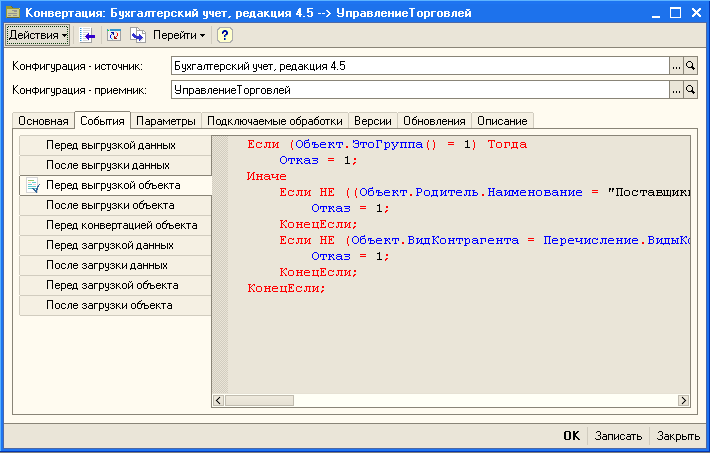 Вернемся к нашей задаче. Для отбора данных нам потребуется обработчик "Перед выгрузкой объекта". Программный код обработчика приведен ниже: